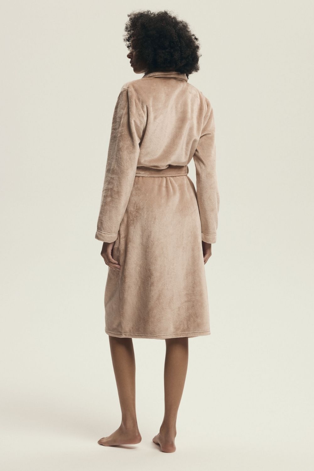 An elegant women’s dressing gown made of shiny knit fabric, which gives the whole outfit a subtle and feminine character. The model has a comfortable cut with practical pockets and a semi-circular bottom, which beautifully shapes the silhouette. The dressing gown has a tie at the waist, allowing it to be adjusted to the figure, and is packed in a plastic bag, perfect also as a stylish gift.