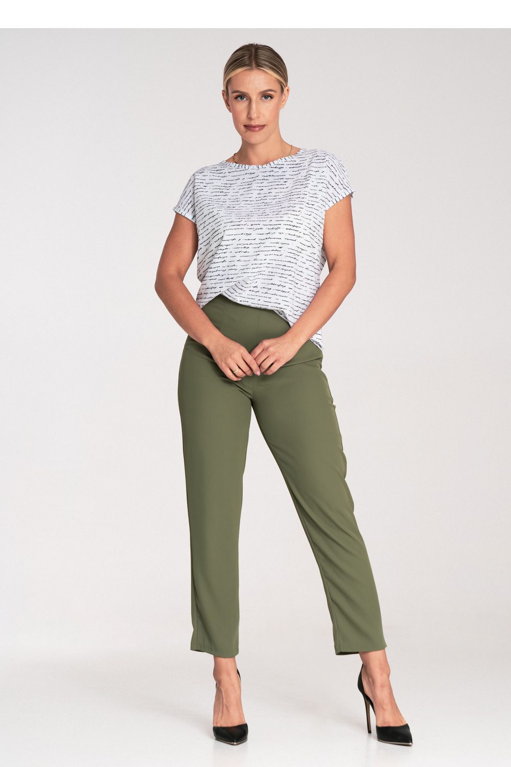 Blouse of simple cut with short sleeves. The blouse has a round neckline, with a fastening on the back with a clasp.