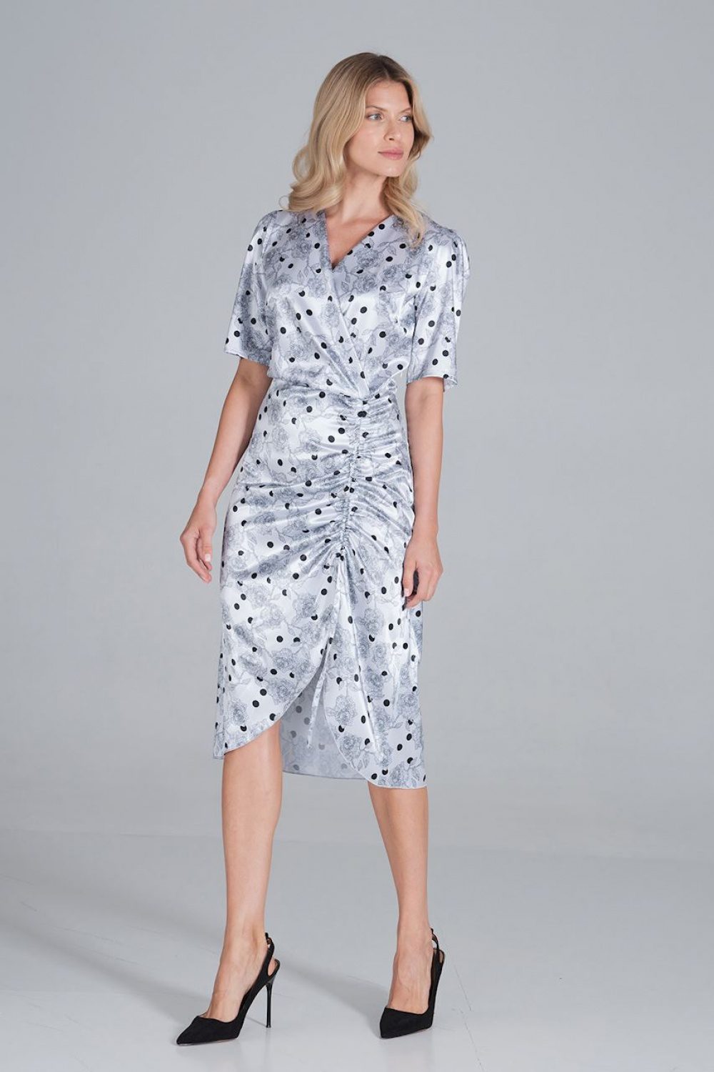 Satin cocktail midi dress. It features an envelope neckline, buffet elbow-length sleeves, and a semicircular slit at the left leg finished with a decorative adjustable crease. Zip at the side, unlined.