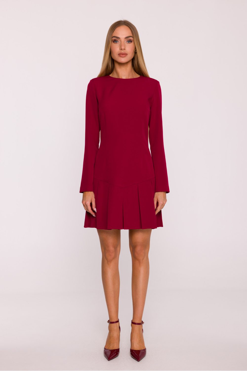 A classic dress made of smooth fabric with a matte finish is a proposal that combines simplicity and elegance in a modern version. The minimalist design makes it perfect for both everyday stylizations and more formal occasions. The model has a subtle boat neckline and long sleeves, giving the whole a timeless character. The dress is fastened with a concealed zipper at the back, ensuring comfort and aesthetic finish. The slightly fitted top is complemented by bottom pleats, adding lightness and feminine charm to the silhouette. The simple, tailored line subtly accentuates the figure, and the mini length gives the dress a modern, girlish character. Designed and made in Poland, created for women who appreciate timeless elegance in a minimalist form.