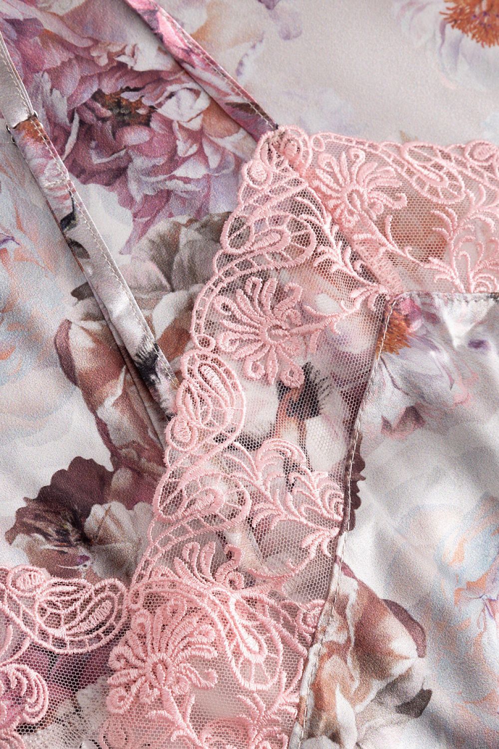 Nightgown with a loose comfortable cut, on thin adjustable straps. Pointed neckline decorated with lace in pink color.