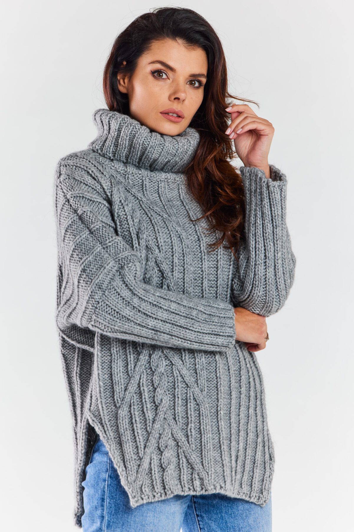 Warm women’s sweater with long sleeves and turtleneck. Turtleneck with decorative plaid embellishments. Slits on the sides.