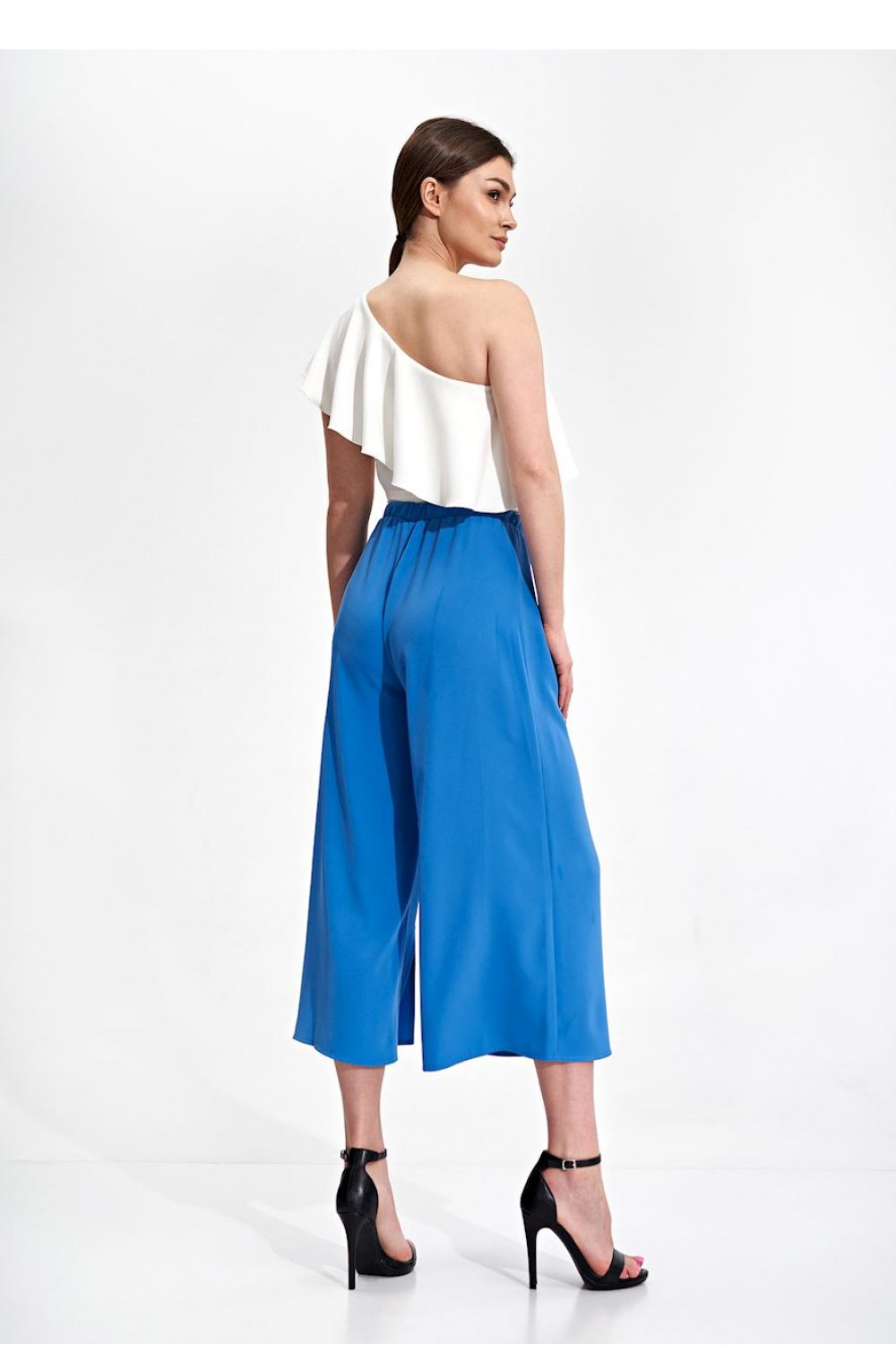 Bell-bottomed pants 7/8, decorative slit in the front at the bottom of the leg. Waistband with sewn in elastic band with decorative binding. No pockets, no fastening.