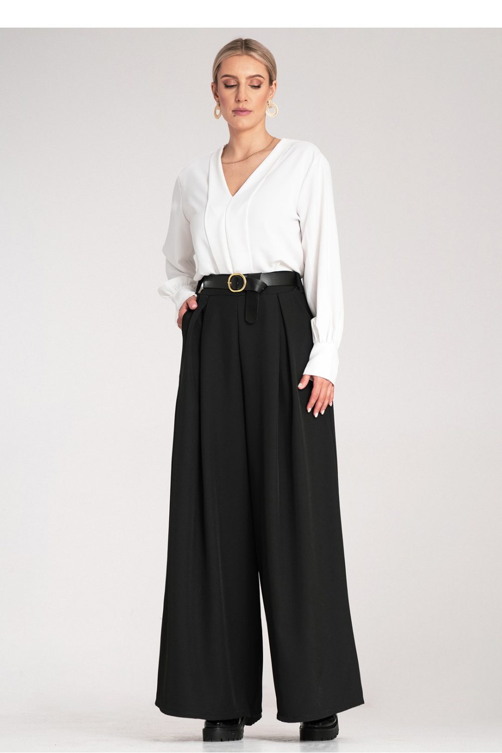 Palazzo pants with a black belt with a buckle. Made of delicate fabric. High-waisted pants. Elastic at the waist with wide legs. Inserted pockets on the sides.