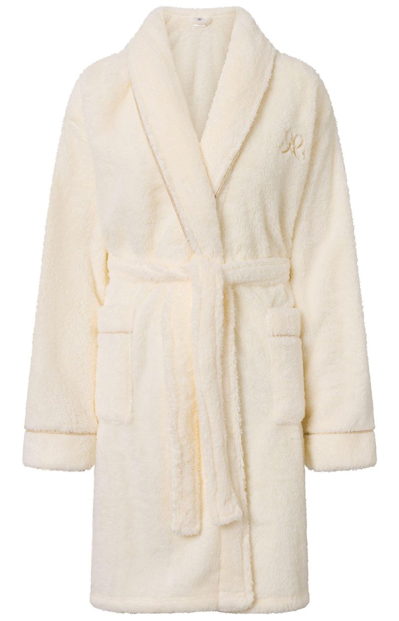 Thirsty for relaxation? Put on a warm, fluffy, soft dressing gown, which will wrap your body and give it an exceptionally pleasant touch. Glamour bathrobe is our proposal for relaxation in a very elegant setting. Both the collar and the sleeves of the dressing gown are trimmed with gold, which not only looks beautiful, but also attracts attention. You will immediately look like a princess in this dressing gown. The dressing gown is made of extremely soft, high quality wellsoft knitwear and comes in a lovely, light ecru colour. There is a tie at the waist and two pockets on the hips. The brand logo is embroidered in gold on the chest.