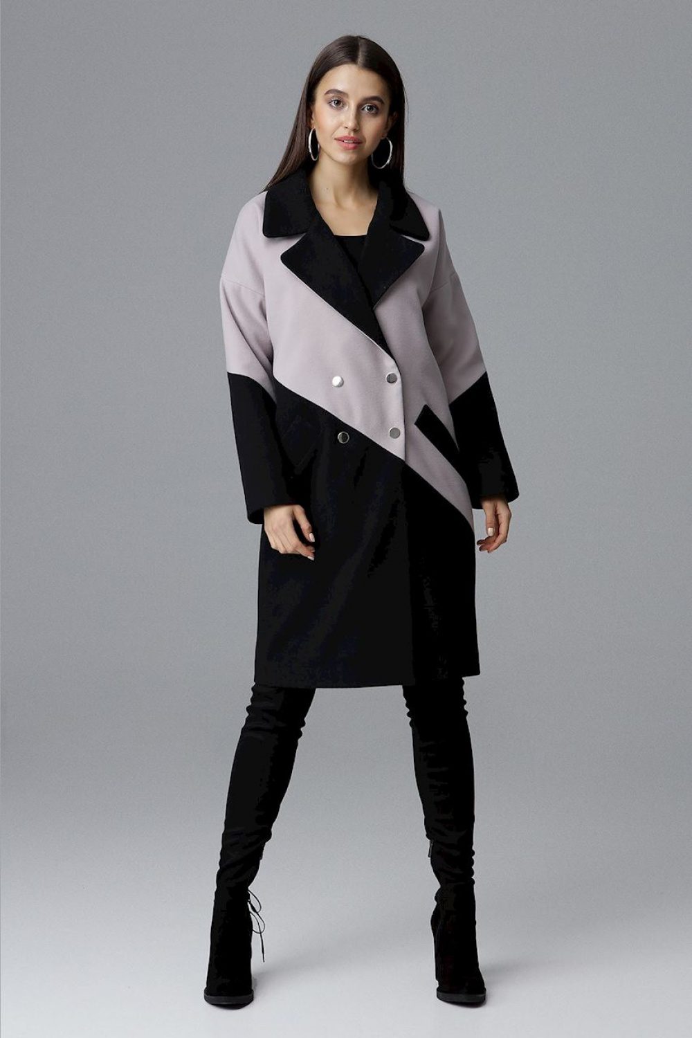 A stylish two-tone coat with a turn-up collar and pockets. Silver-colored snap fasteners add charm. Perfect for everyday use.