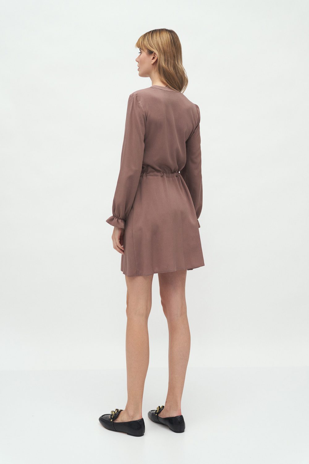 An extremely feminine dress which has a tie that emphasizes the waist. A subtle frill trim on the sleeves makes it look light. Its universal cut will go well with any outfit. Change accessories: a jacket for a ramonet, stilettos for boots and you will look stunning every time. Timeless model, should be in every woman’s wardrobe! An additional advantage is the material of which the dress is made. It will let you feel comfortable all day long!