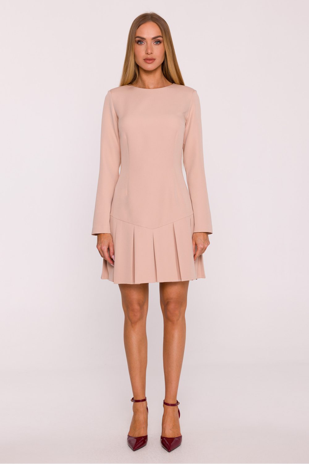 A classic dress made of smooth fabric with a matte finish is a proposal that combines simplicity and elegance in a modern edition. The minimalist design makes it perfect for both everyday styling and more formal occasions. The model has a subtle boat neckline and long sleeves, giving the whole a timeless character. The dress is fastened with a concealed zipper at the back, which ensures comfort and aesthetic finish. The slightly fitted top is complemented by bottom pleats, adding lightness and feminine charm to the silhouette. The simple, tailored line subtly accentuates the figure, while the mini length gives the dress a modern, girlish character. Designed and made in Poland, created for women who appreciate timeless elegance in a minimalist form.