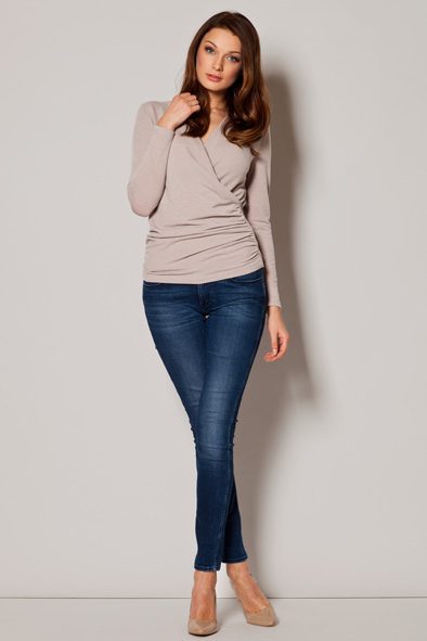 Sweater with a very feminine envelope cut. Long sleeves. V neckline. Creases around the hips perfectly masking the flaws of the figure. Great proposal for everyday as well as for more elegant outings. Universal character and class.