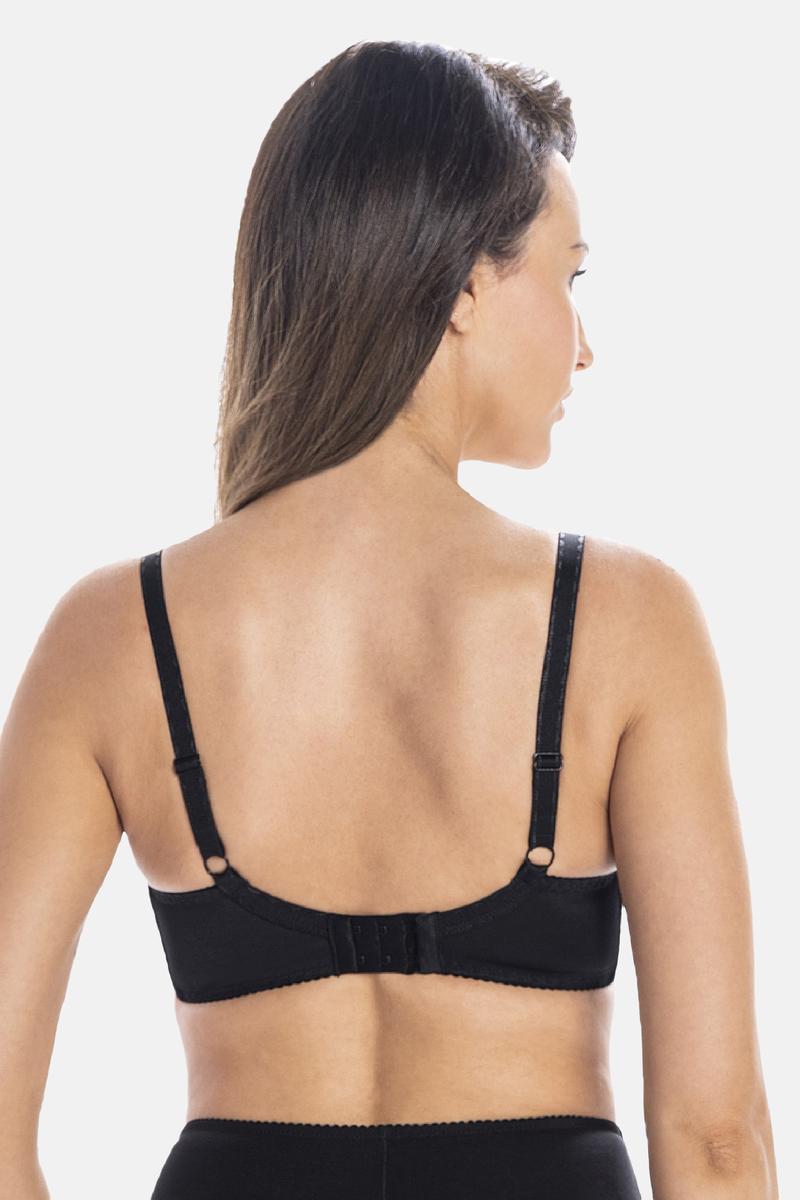 Elegant padded underwired bra in black, made of high quality material, provides excellent support and comfort. Higher build-up on the sides effectively masks imperfections, giving a sense of confidence and comfort. Adjustable straps and hook-and-eye closure allow for a perfect fit, guaranteeing stable support even for larger breasts. The smooth surface of the bra makes it invisible under fitted blouses and dresses, making it an indispensable part of your everyday closet. It perfectly exposes cleavage, while not sacrificing comfort. Thanks to its durability and proper care, the bra will serve for a long time, retaining its properties. Ideal for everyday use, it combines elegance, functionality and comfort, becoming an indispensable element of every woman’s underwear.