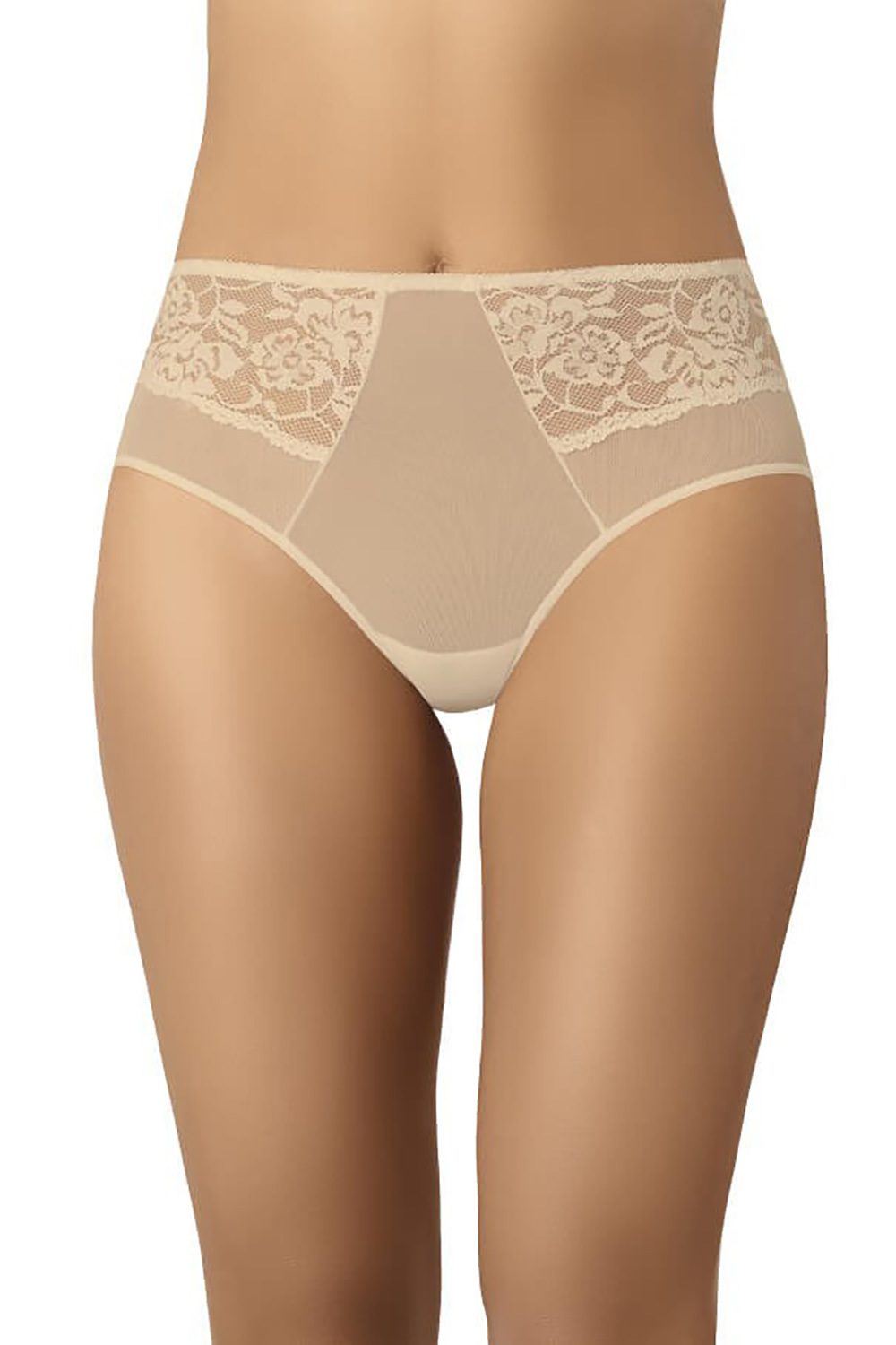 Classic high-waisted panties in beige color. Alluring women’s panties made of transparent and soft to the touch mesh combined with elegant and delicate lace, sewn in the front on both sides. The mesh is incorporated into the center, which with its vertical cuts models the silhouette. Around the thighs there are strong cutouts, which optically lengthen the legs. In the area of the crotch is sewn delicate cotton that absorbs moisture and gives comfort of wearing. The waist and around the legs are trimmed with thin delicate elastic. The back is made of mesh, which encourages, enhances and at the same time hides. The panties are extremely striking and will be worn by women who like to look good. They will be an excellent gift idea for a friend or mother.