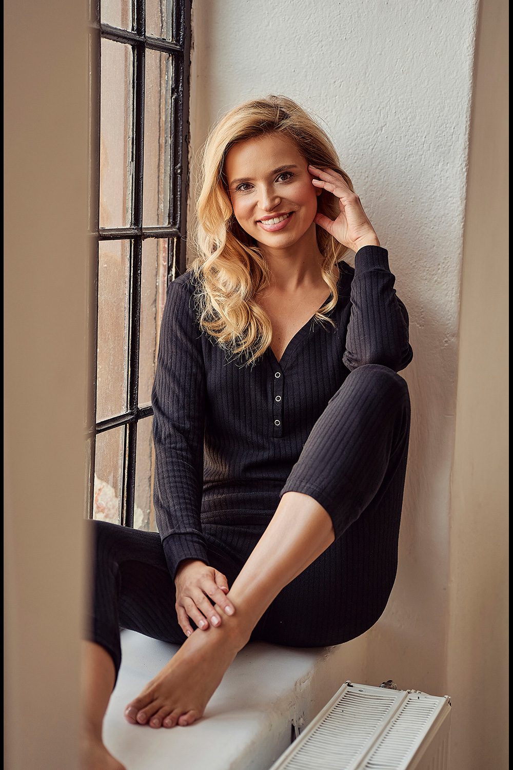 Cotton women’s pajamas made of knitted openwork stripe fabric. Blouse with long sleeves and a neckline fastened with snaps. Complete with fisherman type pants.