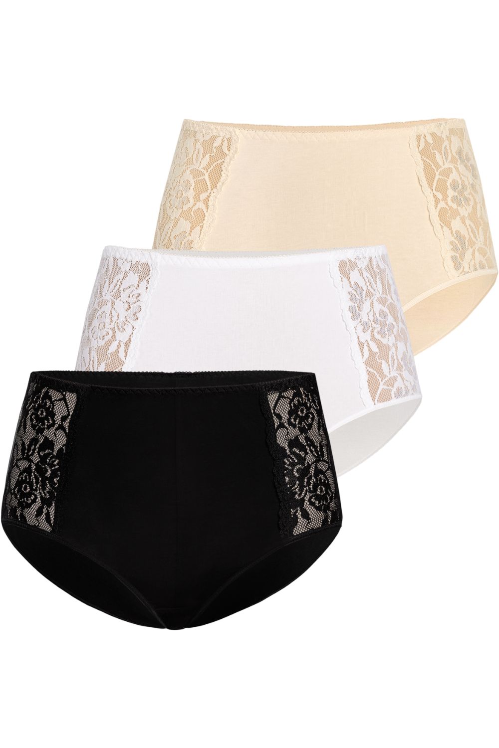 Loren panties come in a three-pack, are popular in the lingerie market, and are eagerly purchased by customers due to their much lower price. The multipack comes in three base colors of black, beige, and white, from size XS to size XXL. The three colors of panties allow you to choose the right color under the clothes women wear. Beige is perfect under white pants or skirts, as it blends with the skin color and the panties are invisible. White under airy summer dresses will also pass the test. On the other hand, black panties will work well under colorful and dark clothes. In addition, Loren panties are made of high-quality airy cotton, which guarantees to keep you fresh and comfortable during use. They have a high waist and thus mask women’s imperfections protruding tummy and sides. In the front on both sides they are decorated with elastic pleasant to the touch, delicate lace with a dense floral motif. A thin elastic band is sewn into the waistband, which does not leave marks on the skin, but supports the panties at the right height and prevents them from sliding down. Loren panties are very comfortable to use will also work well under fitted clothing. They are heavily built-up at the back and cover the entire buttocks.