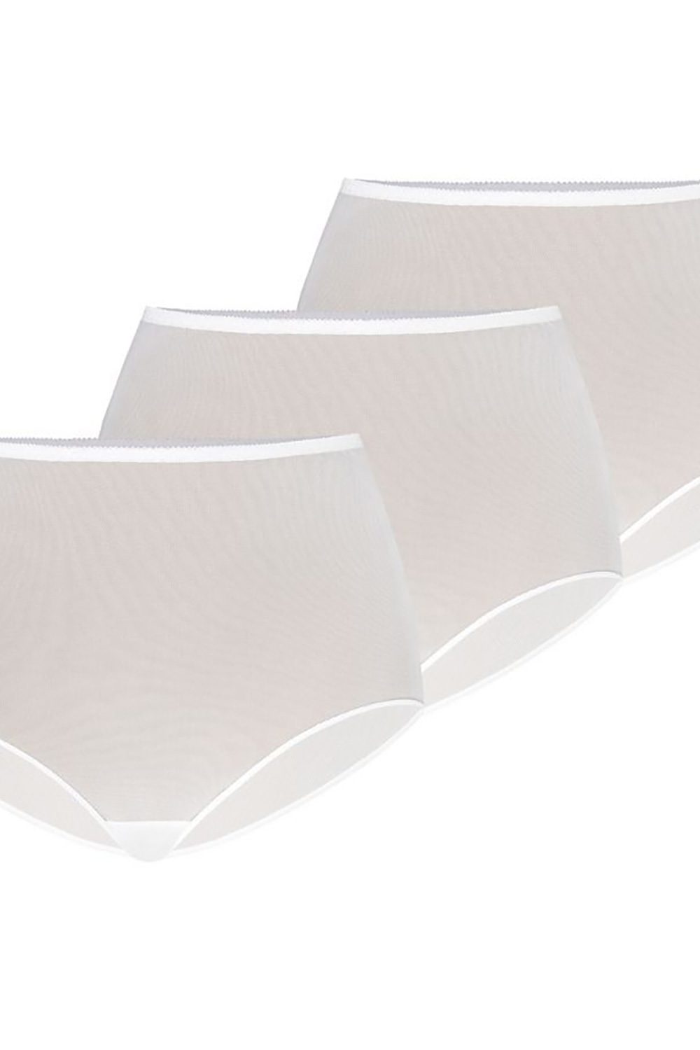 A tri-pack of women’s mesh panties in white with a high waist. The panties in the multipack are more strongly built up, covering the entire buttocks, while revealing them in a sexy way. The crotch area on the inside is lined with cotton for freshness. The sets of panties are the most desirable on the market and are gladly purchased because of their favorable price.