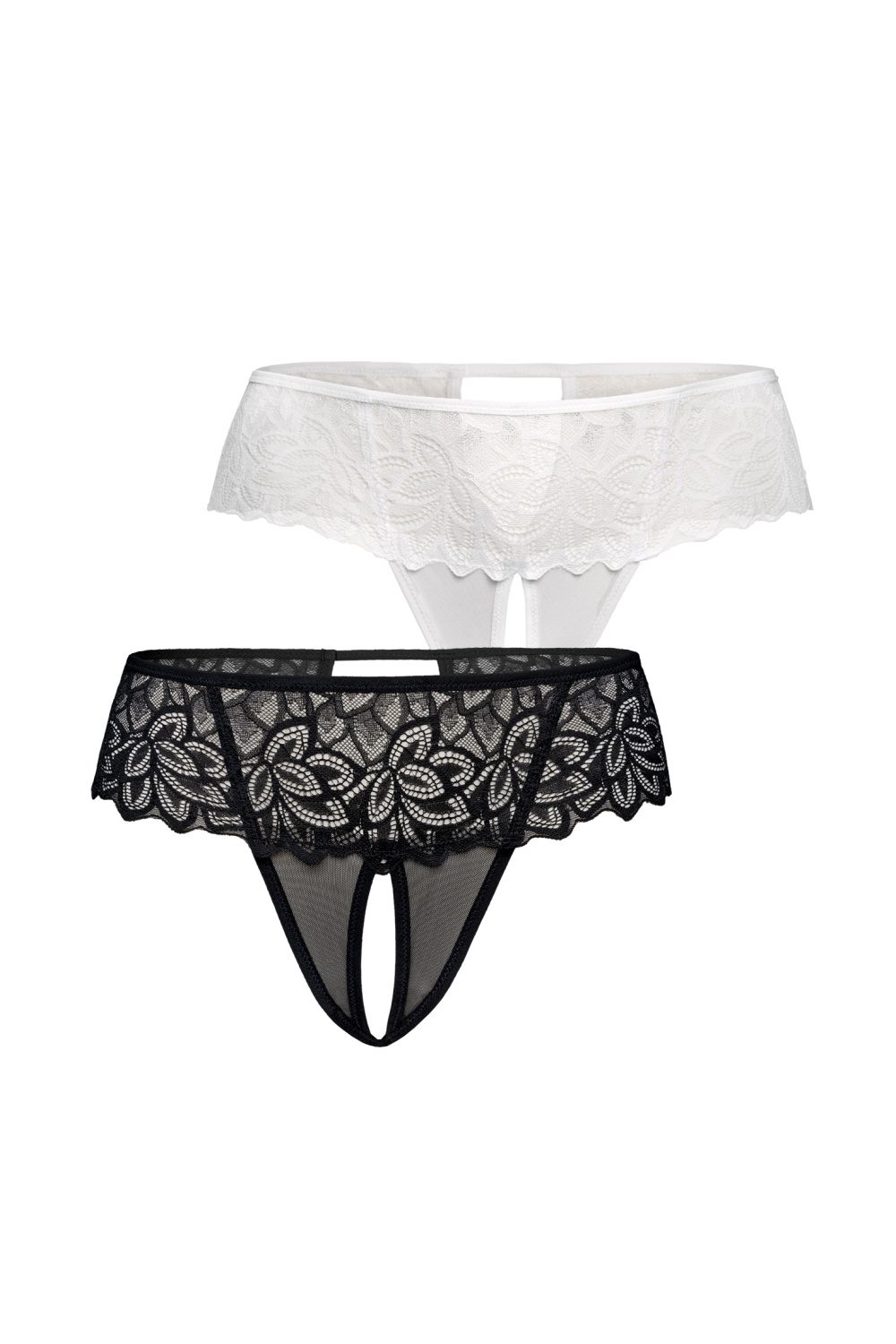 We present a set of elegant women’s thongs in black and white colors, which enchant with their beautiful design and high quality workmanship. The thongs are made using high-quality mesh, which has been decorated with delicate lace inserts, adding subtlety and femininity to them. The cut in the crotch area ensures comfortable wear and emphasizes their seductive character. Additionally, the floral motif gives them a romantic and fresh look, perfect for women who appreciate a sensual style. At the back of the thongs, there is a teardrop-shaped cutout, adding even more sex appeal and surprising details. This set of women’s thongs in black and white colors is an excellent choice for women who want to feel special, seductive, and sensual. Their careful workmanship, high-quality materials, and refined details make them not only an attractive wardrobe element but also guarantee comfort throughout the day.