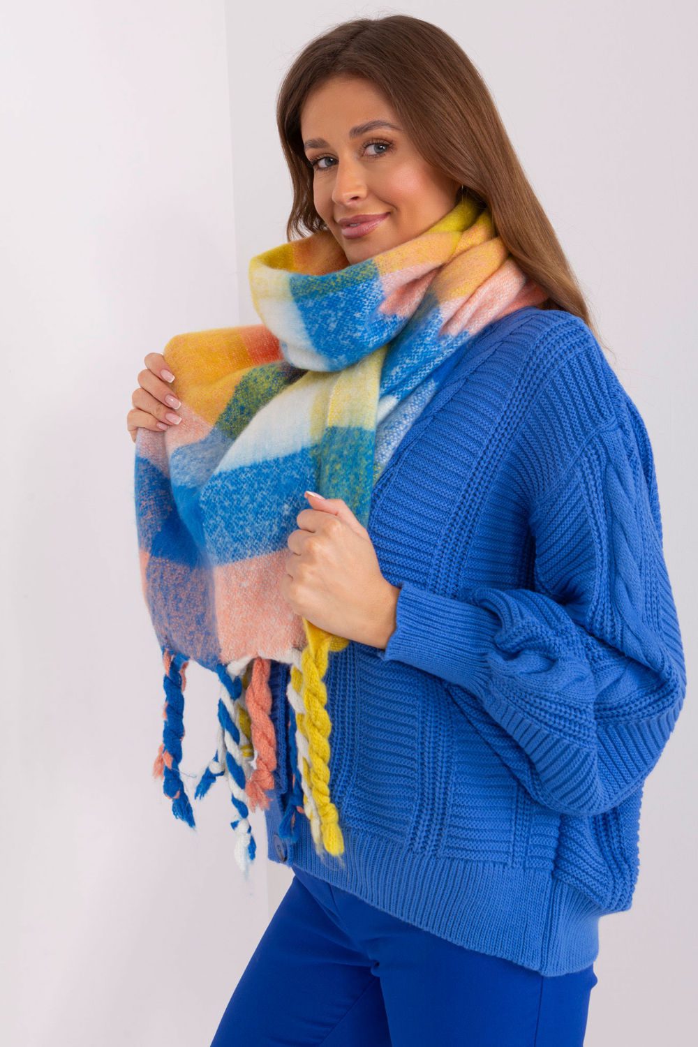 This long colorful plaid scarf is the perfect addition to your fall and winter closet. Made of durable polyester, it is not only practical, but also stylish. The tassels add subtlety and lightness to it. The length of the scarf allows for a variety of ways to wear it, you can wrap it around your neck, leave it loose on your shoulders or use it as an extra layer on colder days. No matter how you wear it, this scarf will be a stylish addition to your closet, adding character and warmth.
