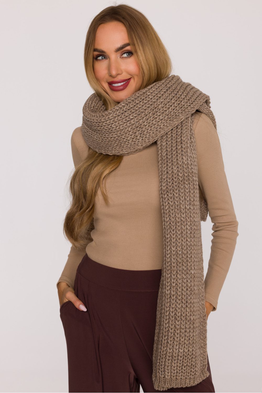 A long, simple scarf made of soft yarn with a thick, ribbed weave. Wide and enveloping, it provides pleasant warmth and comfort on cold days. With its dimensions of 170 cm in length and 45 cm in width, it will be perfect for both everyday and more elegant stylizations.