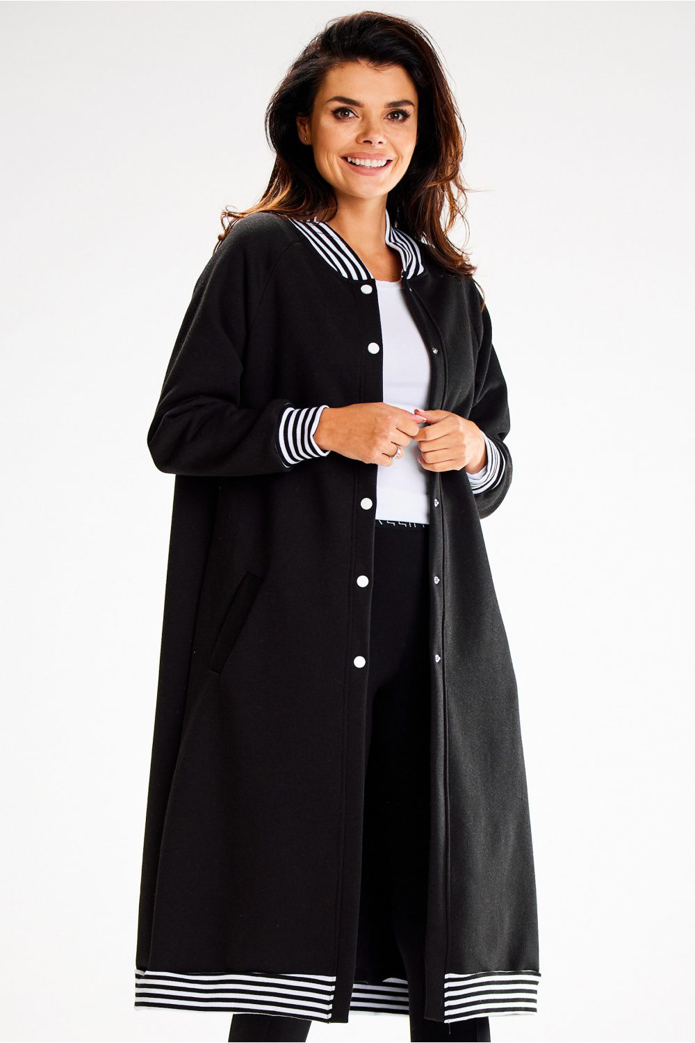 Long, straight sweatshirt with decorative striped ribbing, fastened with white press studs. Slip pockets on the sides.