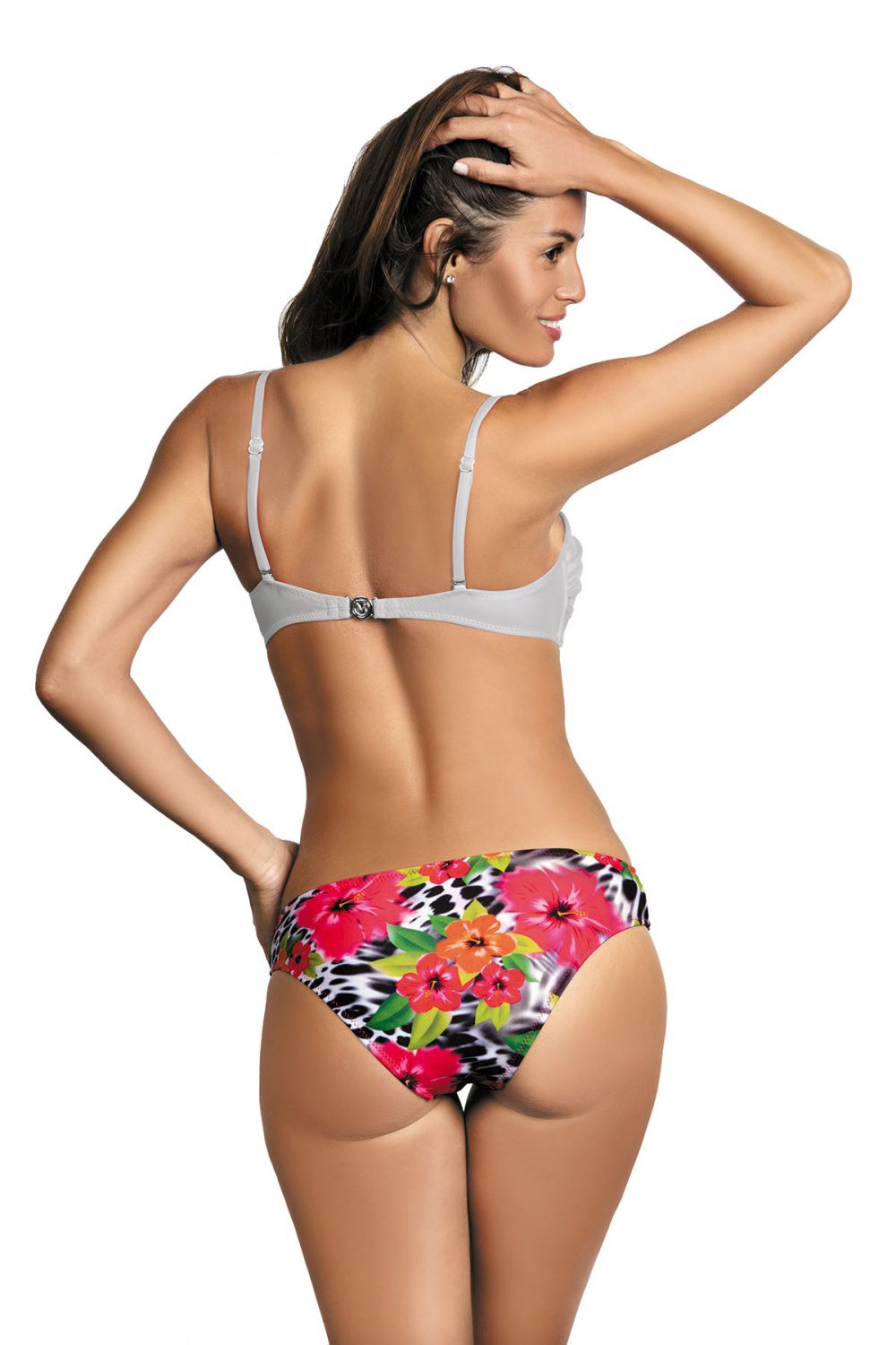 Exceptional, two-piece swimsuit in beautiful colors. Bra with padded cups, enriched with a push up filling (available in sizes S, M, L, XL) – the filling can be removed from the model. Bra perfectly gathers breasts to cleavage and strongly lifts them. Push up enlarges breasts by full size. Lovely “tying” in the middle of the model makes an impression. The straps are detachable. Circuit buckle fastening. Very comfortable briefs with beautiful flowers. The whole looks very feminine. Definitely recommended. One of the best swimsuits from the latest Summer 2017 collection!