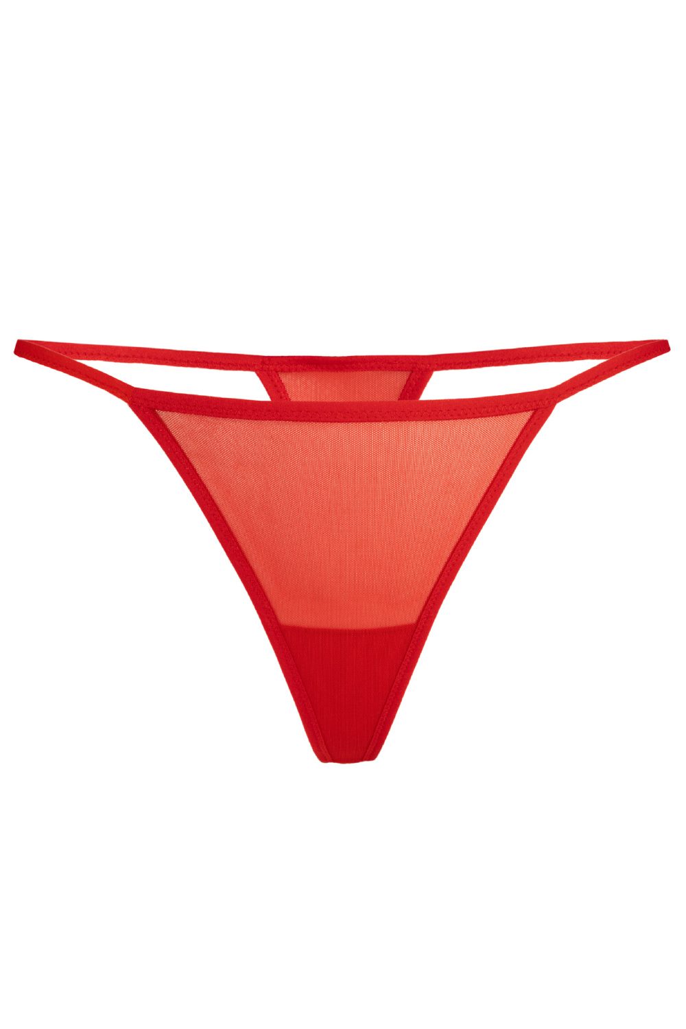 Women’s sexy thongs in juicy red color. They are made of transparent thin, pleasant to the touch fine mesh, which is lined on the inside around the crotch with delicate moisture-absorbing cotton, ensuring freshness and comfort during use. At the back of the thongs there is a tiny triangle, which is an extension of the thin strip that hides between the buttocks. The thongs completely expose the buttocks and please the male eye. The front and back of the thongs are finished with a thin, elastic strap. The thongs are very skimpy yet simple in cut, without any decorations, bows, lace, or decorative sequins. They are addressed to women who value simplicity. The thongs paired with a sexy shirt made of the same thin transparent mesh combined with lace and tightly fitting the body create an impressive set that will heat up the atmosphere in the bedroom. Thongs are a perfect gift for your loved one. Washed at the appropriate temperature, they retain their long lifespan and do not change color. Every woman should have such sexy, red thongs in her wardrobe for special occasions.