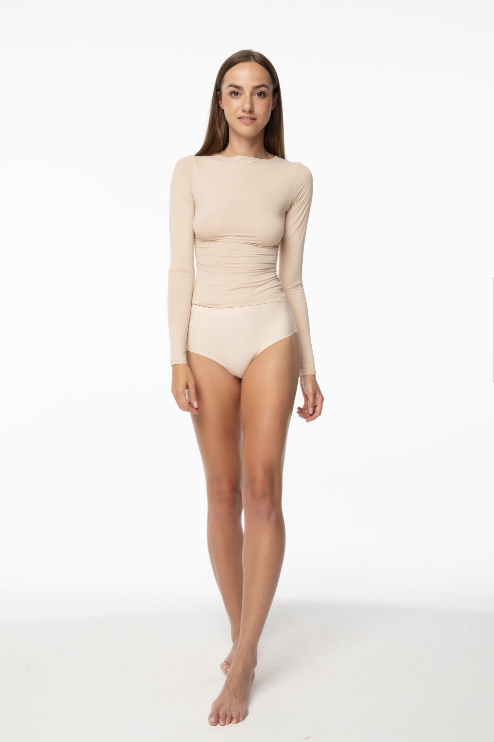 Smooth and stretchy SIMPLE LONGSLEEVE long sleeve blouse in warm natural beige. It is made of a pleasant-to-touch fabric that gently wraps around the body, providing comfort and reassurance throughout the day.